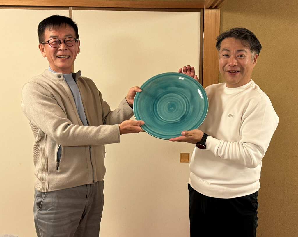 令和7年11月13日、第76回無量G会ゴルフコンペが万壽ゴルフクラブにて開かれました。見事優勝されたのは村部龍也さん(写真右)です。2位は内田賢二さん。3位は代田成利さんでした。表彰式と懇親会は卯之菴さんにて行われました。優勝者には会長の吉村真嗣さん(写真左)より記念碑の陶器皿(小石英允さん作)が送られました。